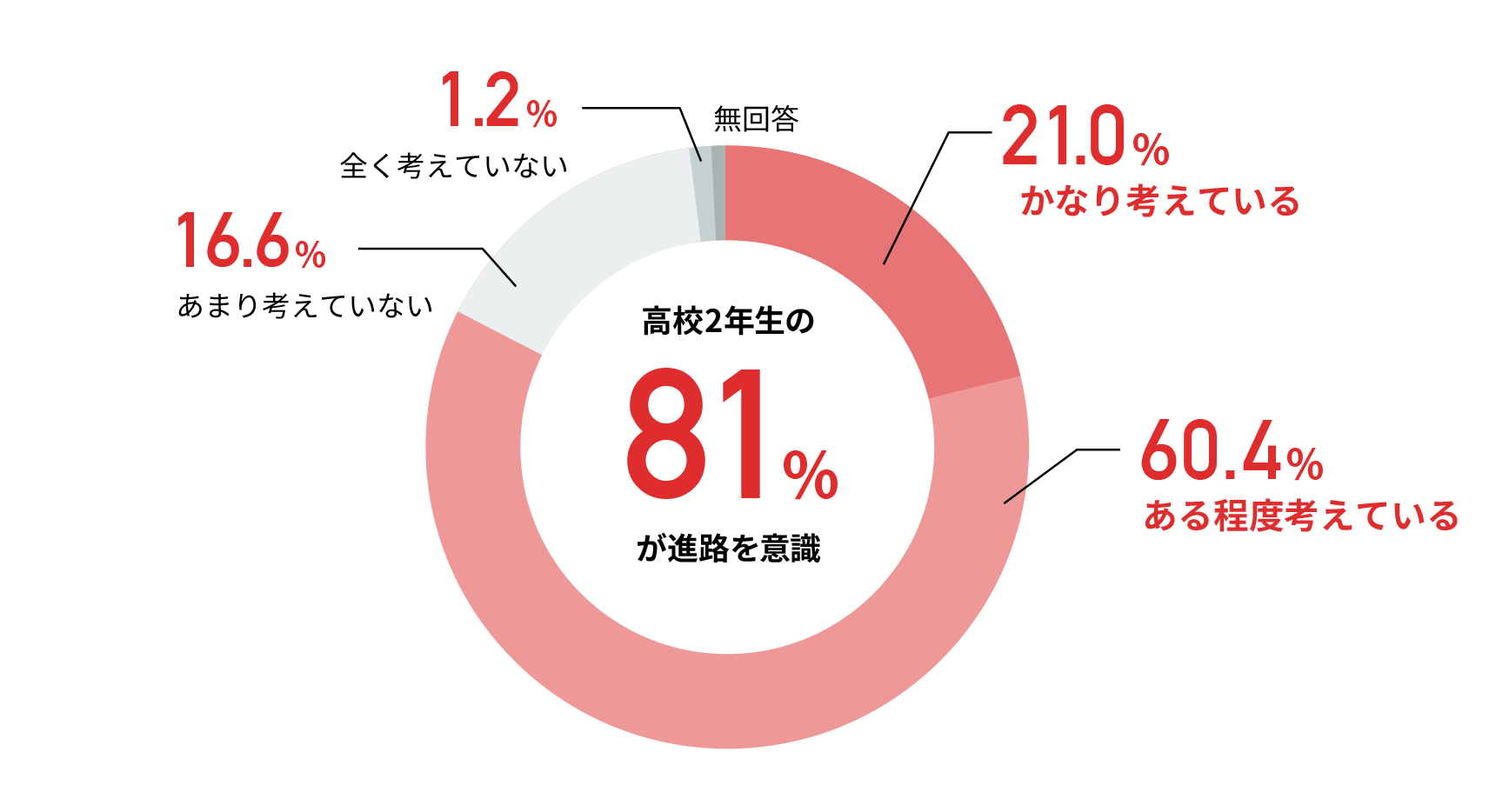 高校2年生の進路意識に関する調査では「かなり考えている」が21%、「ある程度考えている」が60%となり、合わせて81%の生徒が進路を意識していることが分かりました。
