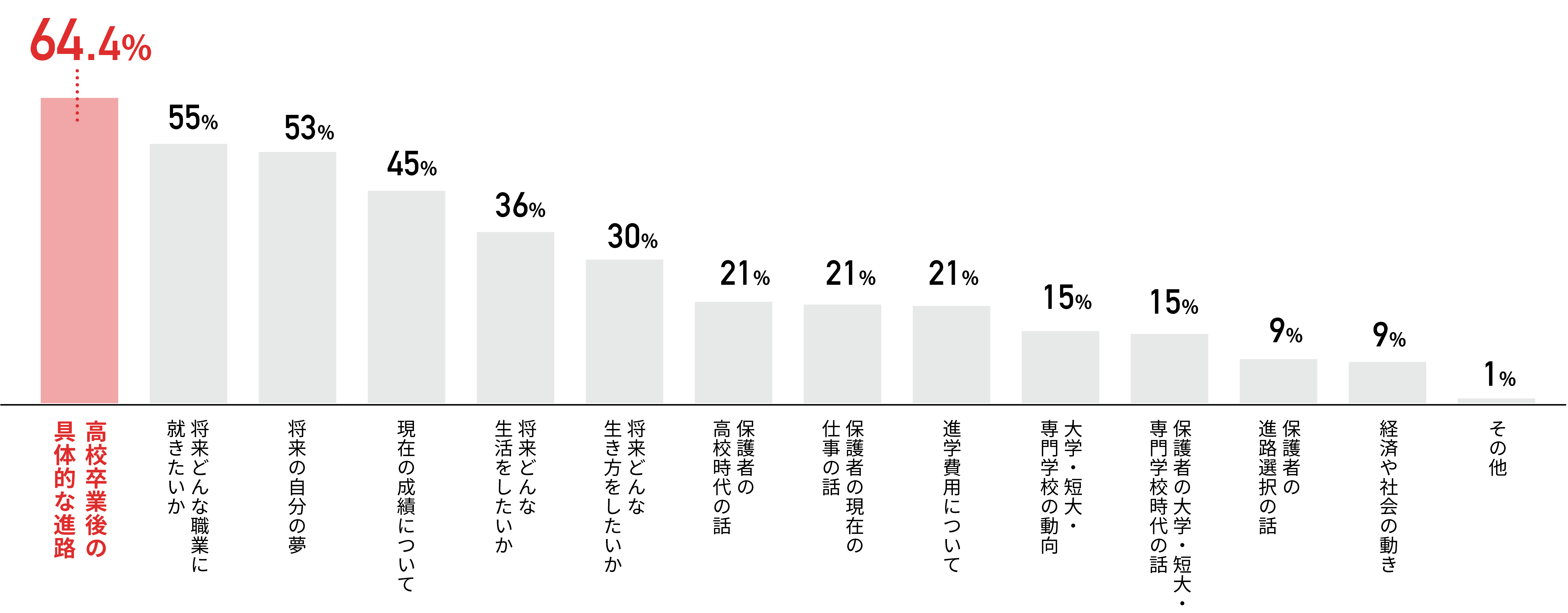 話題としては「高校卒業後の具体的な進路」が60%以上でトップ。主に、進学やキャリアについての話が中心になっています。