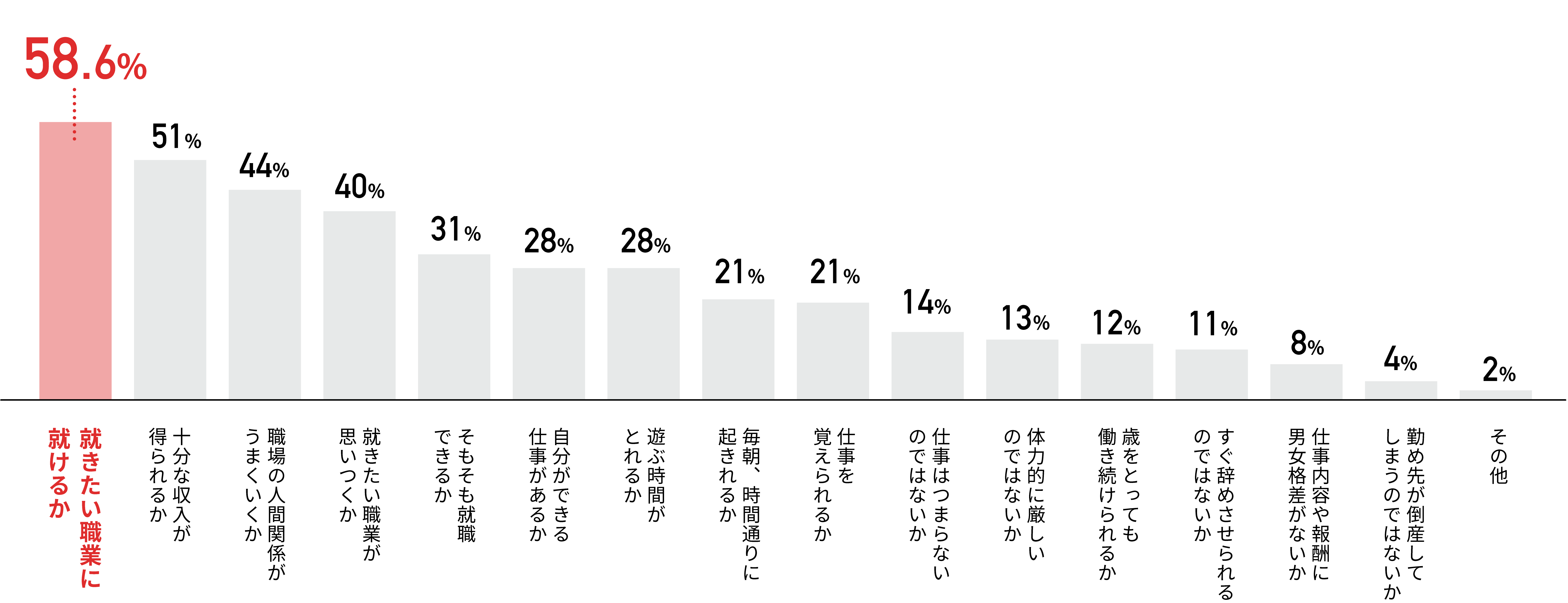 高校生・保護者ともに「就きたい職業に就けるか」が最も気がかりな点となっており、将来に対する期待と不安が入り混じっている様子がわかります。