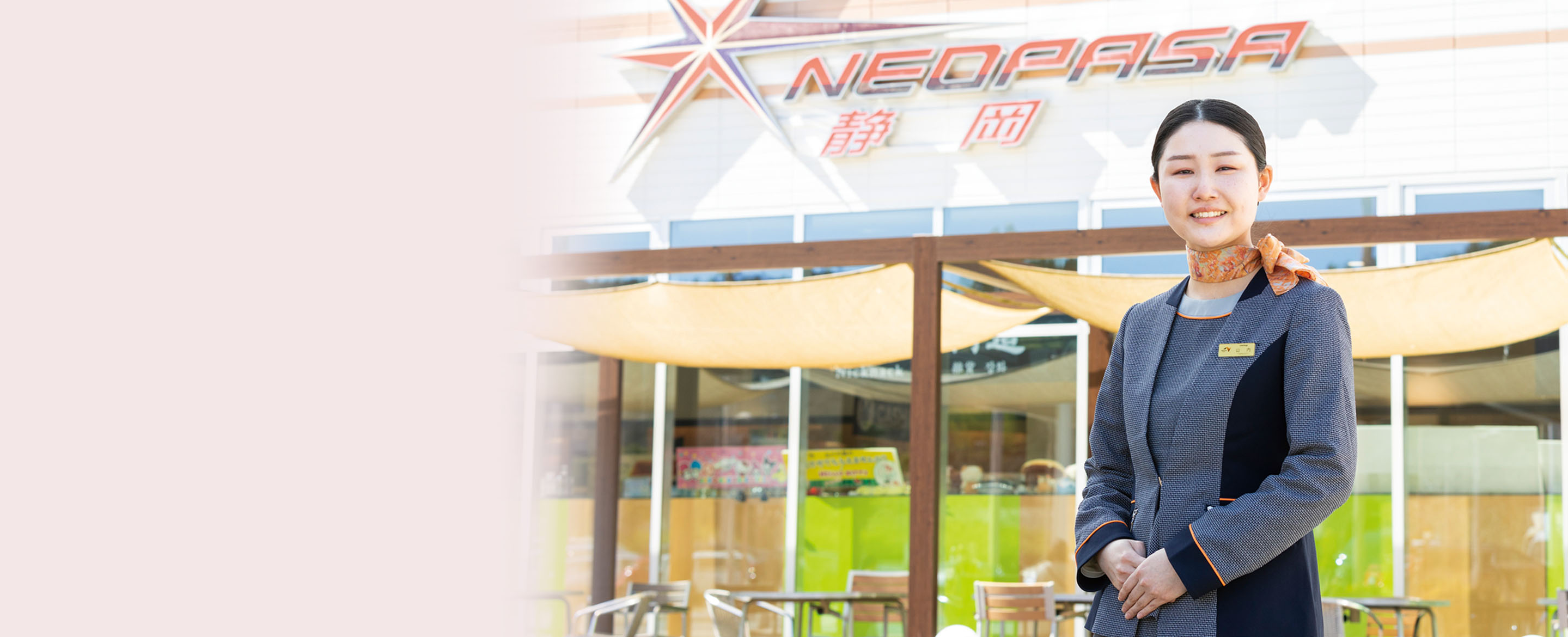 サービスエリア「NEOPASA静岡」でエリア・コンシェルジュを担当しています。観光や仕事などさまざまな理由でお越しいただいたお客さまに対して、交通状況・目的地へのルートといったお問合せ対応や、観光地案内、救急対応なども行います。業務の幅が広く、全てのお客さまに満足いただくことは難しいのですが、その分お客さまの不安を取り除くことができた際には、大きなやりがいを感じます。