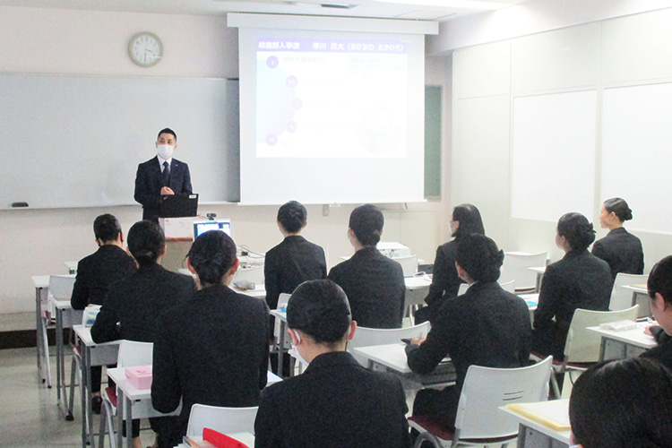 1年次の早い段階から始まる「キャリアサポート」の授業などを通して目指す将来像を明確にしていき、日本で就職活動するための基本知識や心構えを学びます。また、企業説明会で様々な業界や職業への理解を深めていくことができます。クラス担任と就職担当がダブルサポートをしていきます。