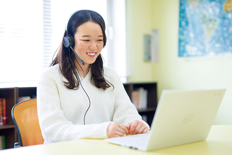 スピーキング力・リスニング力の強化を目的に、学科の学びに即したオリジナル教材によるオンライン英会話レッスンを導入しています。自宅レッスンでは、学生の英語レベルによって内容を柔軟に変えることができ、初心者から上級者まで自分のレベルに合った学習ができます。
