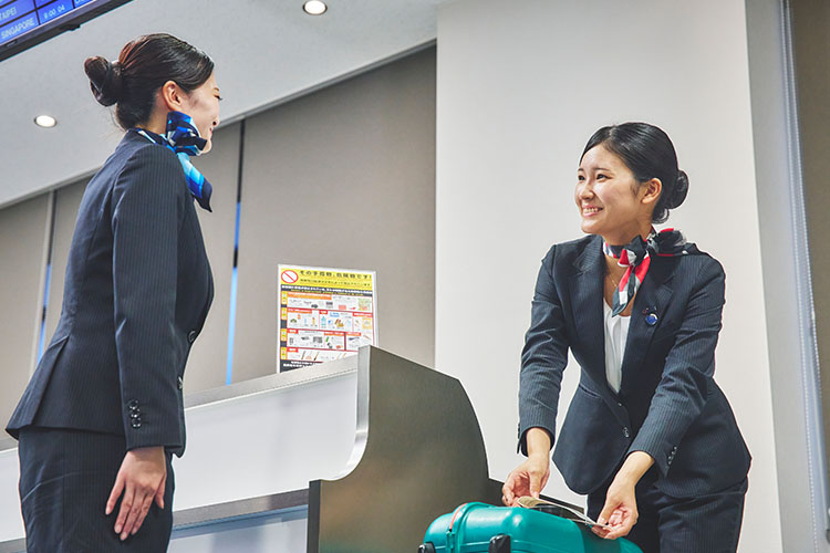 空港カウンターをリアルに再現した搭乗実習室を学内に完備し、グランドスタッフ経験者の教員による実践的な旅客実習を実施します。チェックインや搭乗ゲート案内、空港アナウンスなど、あらゆる業務における実践力を養います。