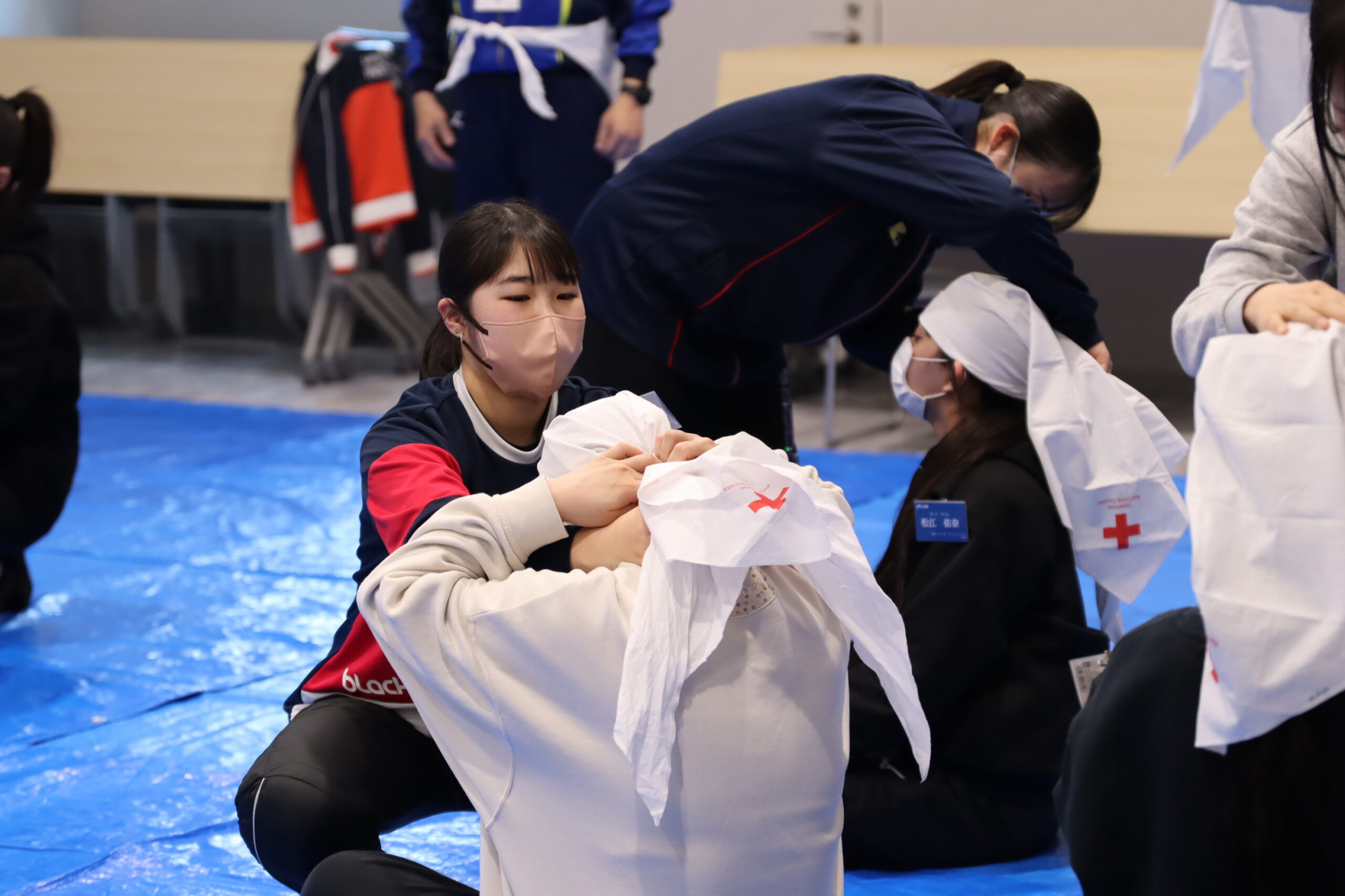 空港内で怪我や病気などの緊急事態が発生した際、的確な対応と処置ができるよう、「赤十字救急法救急員」の資格を取得します。講習を通して人工呼吸や心臓マッサージ、包帯の巻き方などの救命・応急手当の方法を実践的に学びます。
