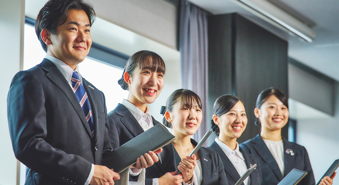 本校の学生が目指す業界全てに共通していること、それは年齢や性別、国籍の異なるさまざまなお客様と接するということ。そしてそれぞれの場面で適切な接客サービスや立ち居振る舞い、上質なおもてなしが求められるということです。本校では、「マナー教育」を基本教育として位置付け、元客室乗務員を中心としたマナーのプロフェッショナルの指導のもと挨拶や立ち居振る舞い、身だしなみ、おもてなしの心を磨きます。本校学生のマナースキルは、実際に多くの企業様から高い評価をいただいています。