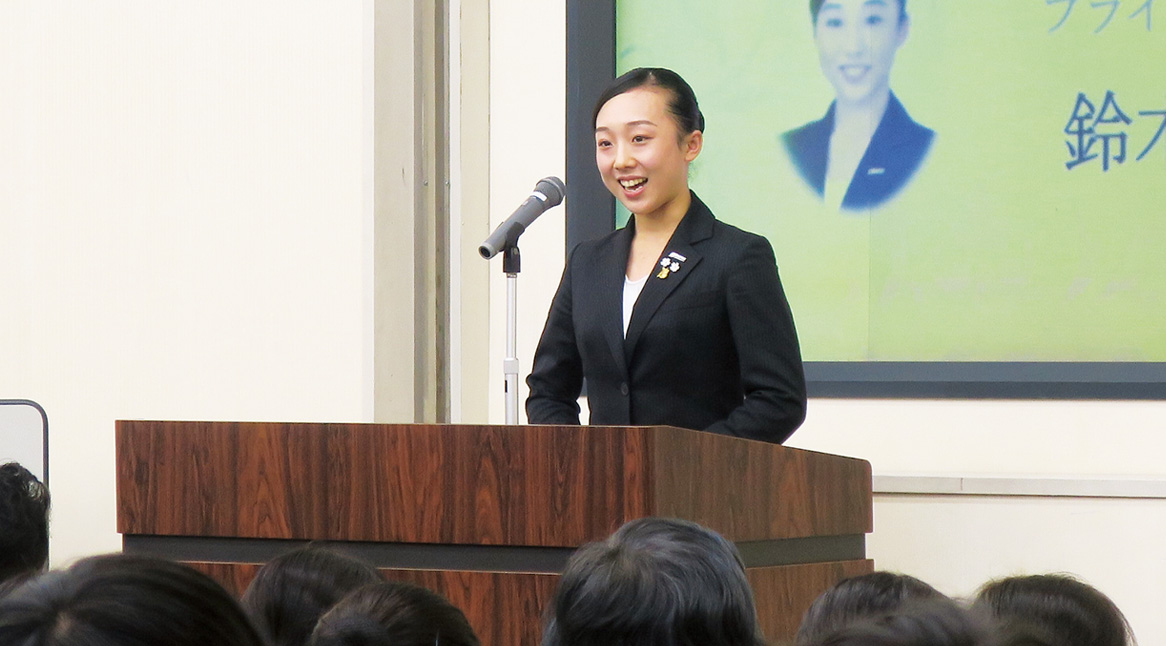 年2回実施される「マナーコンテスト」。日頃からマナーに優れ、ほか学生の模範となる学生が選ばれます。ロールプレイング部門とスピーチ部門があり、マナー最優秀者には「ベストマナー賞」、優秀者には「マナー優秀賞」、優良者には「マナー優良賞」として校長から賞状と桜のピンバッジが贈られます。ベストマナー賞を継続受賞した学生は「マナーマイスター」として認定されます。